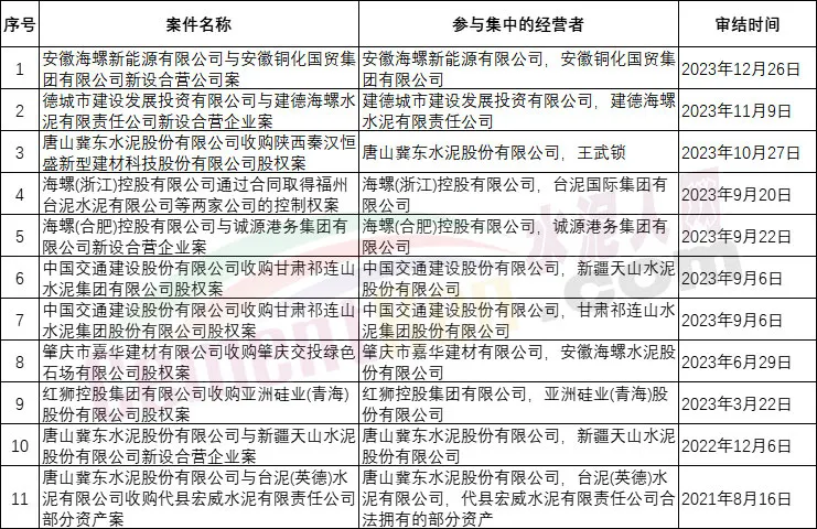 2023年市场监管总局公布的《无条件批准经营者集中案》中11例,涉及水泥行业海螺水泥、冀东水泥、台泥水泥、红狮水泥等多家头部企业。